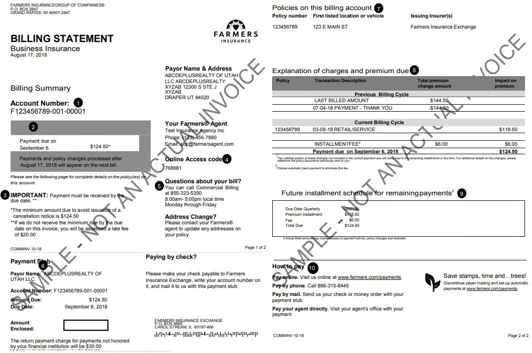 If you are not already on an automatic bill payment plan, this will list your available payment options. To avoid the hassle of buying stamps or remembering to make your payment, you may want to have your payment automatically drafted from your bank account – you can contact your Farmers® agent or visit www.farmers.com/payments/ to sign up.